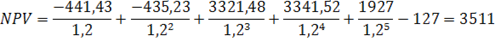Чистая текущая стоимость проекта (NPV) при ставке сравнения 20 % годовых и интервале планирования 5 лет составляет: