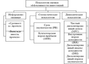 В последнее время многие управленческие решения, касающиеся принятия каких-либо проектов, в большинстве своем основываются на результатах экономического анализа с использованием показателей оценки эффективности капитальных вложений. Предлагается следующая классификация показателей оценки эффективности инвестирования, которые являются наиболее популярными на практике и используются как российскими предприятиями, так и компаниями в странах с развитой рыночной экономикой (рис. 1.3).