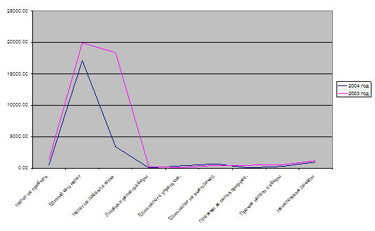 Налоговых доходов в федеральный бюджет за 2004 год поступило 22000 тыс.руб., что составило 94,74% общей суммы доходов в федеральный бюджет. Наблюдается снижение доли налоговых доходов по сравнению с уровнем прошлого года на 18453 тыс.руб. или на 45,62%.