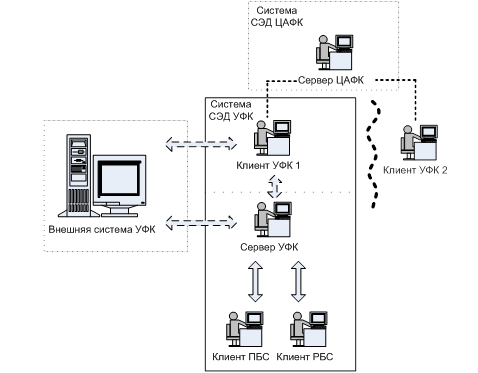 Данная схема документооборота состоит из сервера УФК и внешней системы. В рисунке поддерживается следующий функционал:
