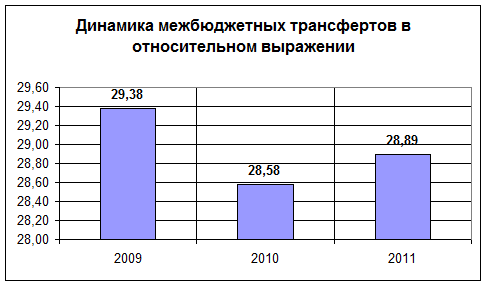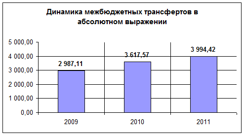 Наибольший удельный вес в классификации расходов занимают межбюджетные трансферты. В 2009 году доля расходования этих средств составляет 29,38%. Если говорить о динамике этого показателя, то уже в следующем году (2010) он снижается на 0,8%. Но в денежном эквиваленте увеличивается на 630,46 млрд. руб. В среднесрочной перспективе предусмотрено абсолютное увеличение межбюджетных трансфертов к 2011 году до 3 994,42 млрд. рублей, что составляет на 1 007,31 млрд. руб. больше по отношению к 2009 году. В диаграмме 1 и 2, можно наглядно увидеть, как происходит изменение этого показателя.