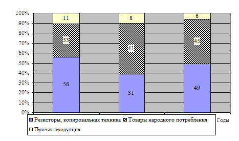Анализируя структуру произведенной продукции за 2001-2003 гг., можно сделать вывод о том, что наибольший удельный вес в структуре продукции ОАО «Копир» занимает производство товаров народного потребления, второе место по удельному весу в объеме производства занимает продукция резисторов и копировальной техники.