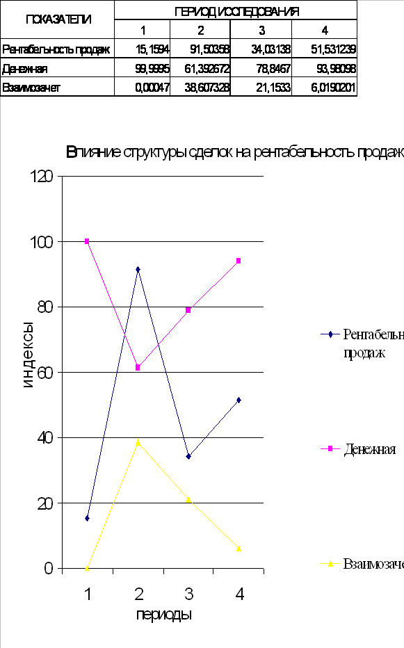По графику видно, что при повышении сделок по взаимозачету и не большое уменьшение сделок по денежной форме во втором периоде фирма достигла наибольшего числа рентабельности продаж. Но как только снизились сделки по взаимозачету, а денежные наоборот возросли, рентабельность продаж в третьем периоде снизилась. Однако в четвертом периоде фирма продолжала все меньше использовать сделки по взаимозачету, а больше стала использовать денежные сделки. При этом рентабельность продаж стала расти.