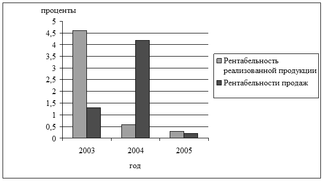 Изменение показателей рентабельности реализованной продукции и рентабельности продаж ОАО «Аскольд» за 2003-2005 гг. показано на рис.5.