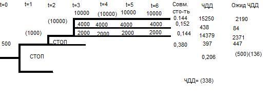 Например, если компания решает реализовывать проект в точке t=0, то она должна потратить 500 тыс.долл. на проведение маркетингового исследования. Менеджеры компании оценивают вероятность получения благоприятного результата в 80%, и вероятность получения неблагоприятного результата в 20%. Если проект будет остановлен на этой стадии, то издержки компании составят 500 тыс. долл.