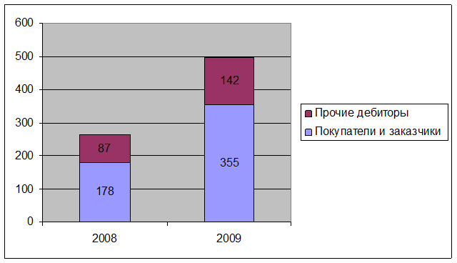 Анализ движения дебиторской задолженности по составу позволил установить, что ее увеличение в основном произошло из-за расчетов с покупателями и заказчиками за товары. Сумма неоплаченных счетов покупателями и заказчиками увеличилась на 177 тыс.руб. и составила 355 тыс.руб. на конец года. Обнаруженная тенденция ставит предприятие в зависимость от финансового состояния партнеров. Кроме того, произошло увеличение доли дебиторской задолженности в оборотных активах с 4,13% в 2008 году до 9,1% в 2009 году.