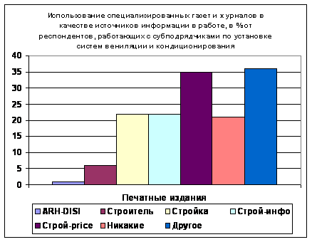• Известность компаний, устанавливающих системы вентиляции и кондиционирования среди людей в генподрядных организациях работающих с субподрядчиками в этой области очень низкая. Спонтанно (без подсказки) около 40% из них не смогли вспомнить ни одной компании, а около 30% не смогли вспомнить ни одной даже при зачитывании им списка самых крупных компаний.
