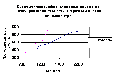 Немаловажным является также анализ ценовых преимуществ различных марок кондиционеров, учитывая такие параметры, как цена и производительность по воздуху. Для примера приведу совмещенный график сравнения марок кондиционеров (настенные сплит-системы, работающие на охлаждение и нагрев). Для примера примем, что Бюро торгует -LG, Климат проф – Panasonic.