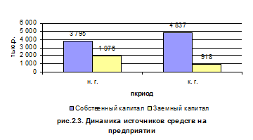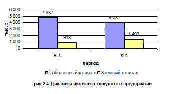 Анализ данных таблицы 2.4 позволяет сделать вывод о отрицательной динамике в изменении источников средств предприятия. Собственный капитал уменьшился на 800 тыс. р. (или на 16,54%), заемный капитал увеличился на 485 тыс. р. (или на 52,83%). Уменьшение собственного капитала и увеличении заемного привело к изменению структуры источников средств предприятия. Доля собственного капитала уменьшилась с 84,05% на начало года до 74,21% на конец года. Собственный капитал является основой финансовой независимости предприятия от внешних источников. Динамика источников средств на предприятии представлена на рис.2.4.