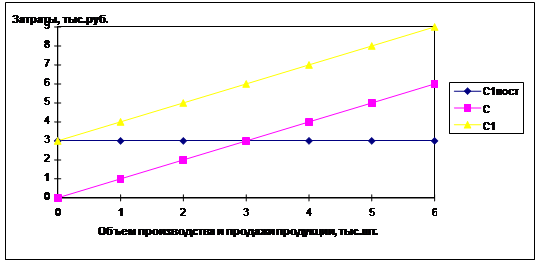 На рис. 7 представлен график, позволяющий проиллюстрировать понятие постоянных, переменных и общих затрат.