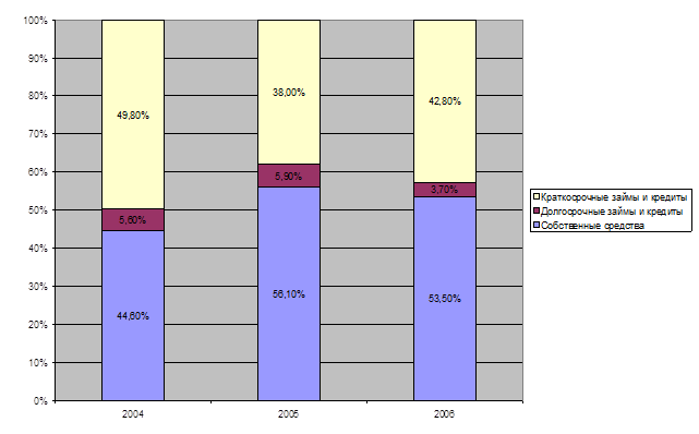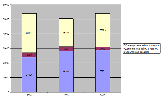 На рисунке 5 хорошо видно, что у предприятия увеличиваются собственные средства, уменьшаются к 2006году долгосрочно заемные средства, краткосрочно заемные средства уменьшаются в 2005 году до 19154 тыс. руб. с 26885 тыс. руб. в 2004 году, а затем возрастают до 23089 тыс. руб. в 2006 году.