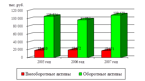 Рисунок 2.1 - Динамика изменения внеоборотных и оборотных активов ОАО «НМУ-3» за 2005 – 2007 гг.