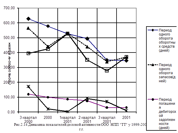 Динамика показателей деловой активности (Рис. 2.14) по оборотам запасов и оборотных средства показывает, что продукция ООО НПП «ТТ» начинает постепенно завоевывать рынок покупателей, однако существуют большие проблемы с постоянным графиком реализации продукции.