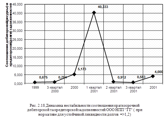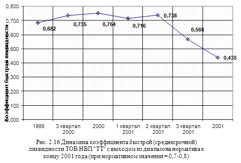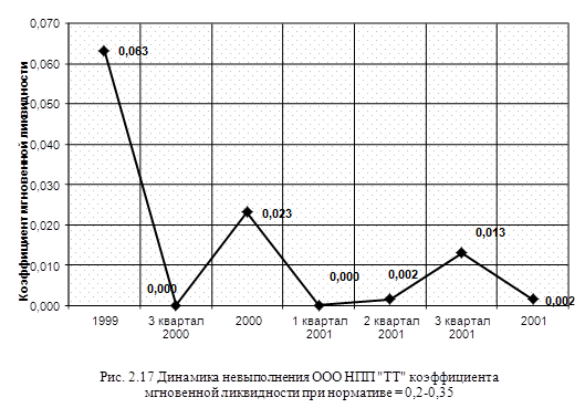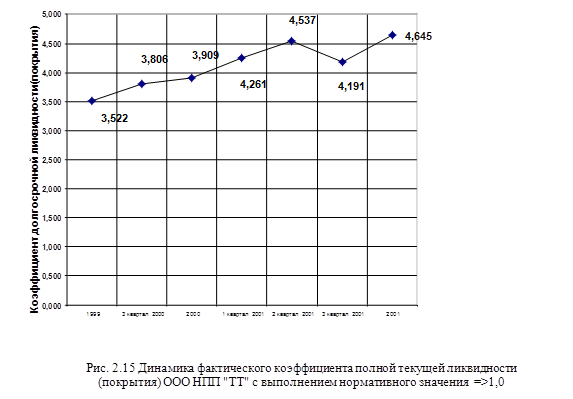 Как видно из данных таблиц расчетов коэффициентов ликвидности (табл. Б.5 Приложения Б) и графиков черт. 2.15 – 2.18 (динамика ликвидности за 2000–2001 года), в ООО НПП «ТТ»: