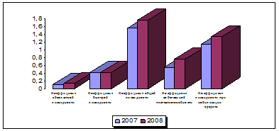 Все нормативные коэффициенты, необходимые для платежеспособности и финансовой устойчивости предприятия, находятся достаточно близко к нормативным значениям. Во вторых, в 2008 году наблюдается повышение их абсолютной величины. Повышение коэффициента общей ликвидности свидетельствует о повышении уровня платежеспособности предприятия.