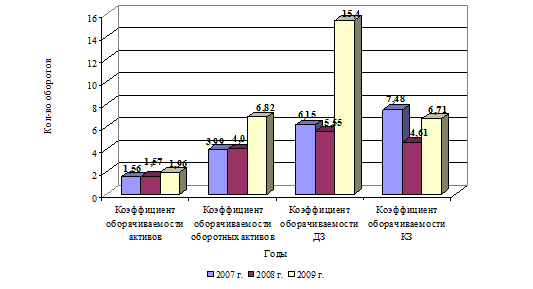 Проведем расчет показателей оборачиваемости предприятия ОАО «ВК и ЭХ» за 2007 – 2009 гг., результаты расчетов представим в таблице 15.