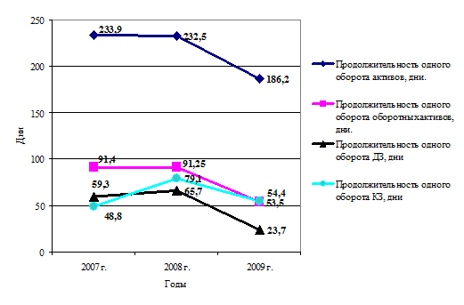 Рисунок 13 - Динамика продолжительности оборачиваемости показателей деловой активности ОАО «ВК и ЭХ» за 2007 – 2009 гг.