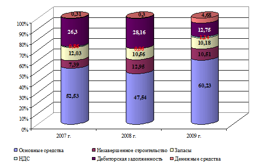Данные рисунка 5 показывают значительное увеличение доли денежных средств в 2009 году, рост по сравнению с 2008 годом составил 4,38%.