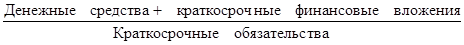 Коэффициент абсолютной ликвидности (Ка.л.) является наиболее жестким критерием ликвидности предприятия. Значение показателя характеризует мгновенную ликвидность (платежеспособность) организации на момент составления баланса, показывает, какая часть краткосрочных обязательств может быть погашена в ближайшее время за счет денежных средств и краткосрочных финансовых вложений [15, с.431]. Чем выше его величина, тем больше гарантия погашения долгов, так как для этой группы активов практически нет опасности потери стоимости в случае ликвидации предприятия, и не существует никакого временного лага для превращения их в платежные средства. Значение коэффициента признается достаточным, если он составляет 0,2-0,3. Если предприятие в текущий момент может на 20%-30% погасить все свои долги, то его платежеспособность считается нормальной. Учитывая неоднородность структуры сроков погашения задолженности, указанный норматив следует считать завершенным. Для получения реального ограничения следует учитывать: средний срок погашения займов, кредитов, средний срок погашения кредиторской задолженности. Значение показателя абсолютной ликвидности представляет интерес для поставщиков сырья и материалов. Он характеризует платежеспособность на дату составления баланса и определяется как отношение наиболее ликвидных активов к сумме наиболее срочных обязательств и краткосрочных пассивов: