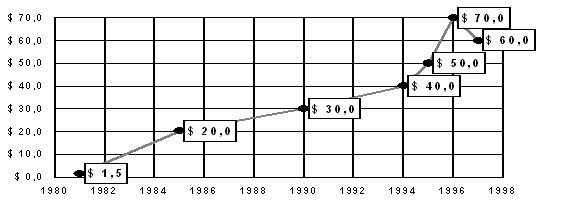 На сегодняшний день компания “Кока-Кола” является одной из самых дорогих компаний в мире, существенный скачек в развитии произошел в 1981-1997 годах. Об этом говорят цыфры, показанные на рис.5 и табл.4.
