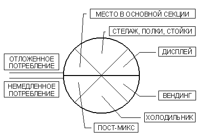 · Отложенное потребление (домашнее потребление) - покупатель не потребляет напиток сразу, а откладывет на более поздний момент, до наступления приемлимых для него условий (домашняя обстановка), покупатель производит запланированную покупку. В этом случае используются такие виды торгового оборудования, как стелажи, полки, пластиковые стойки, дисплеи и организация места продаж непосредственно в основной секции (отдел “соки-воды”, “винно-водочный”)