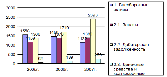 – внеоборотных активы в общей величине активов преобладают: в 2005 г. их доля составляет 37,59%, в 2004 г. снижается до 21,88%, при этом их величина снижается в 2007 г. на 2,26%. Структура и динамика активов наглядно представлена на рисунке 3;