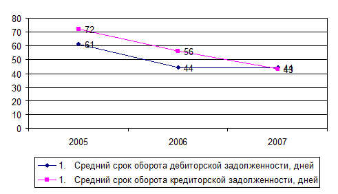 – показатель оборачиваемость дебиторской задолженности повысился с 6,0 оборота в 2005 году до 8,28 в 2007 году, соответственно уменьшился период погашения дебиторской задолженности. Данный факт свидетельствует о росте платежеспособности покупателей и об увеличении эффективности деятельности Общества в области управления неплатежами, в части дебиторской задолженности;