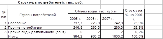 Основным потребителем услуги предприятия является население в 2006 г. – 75% от общего объема отпускается по Договорам с СЕЗ и администрацией поселка Промышленная населению. Отсутствие приборов учета потребления воды влечет за собой учет объемов расхода воды населением по нормативам потребления. В обслуживаемых предприятием населенных пунктах наблюдается низкий уровень фактического потребления воды.