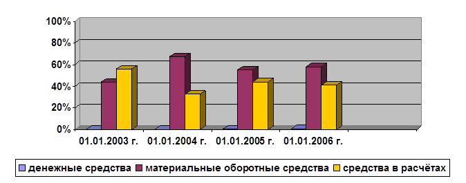Материальные оборотные средства занимают ведущее место, однако и они дали темп снижения с 67,3% до 55,4% в 2004 г. и чуть повысились до 58% в 2005 г., но всё равно ниже на 9,3% с уровнем 2003 г.