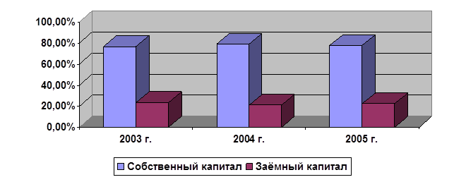 Процентное соотношение собственного и заёмного капитала за 2003 – 2005 гг. по отношению ко всему капиталу