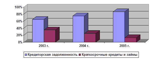· имеют место значительные темпы роста краткосрочной кредиторской задолженности, достигшие в 2005 году 125%, т.е. по сравнению с базисным (2003) годом увеличились на 25%.