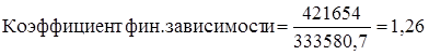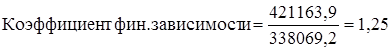б) Обратным коэффициентом является коэффициент финансовой зависимости. Он показывает, какая сумма общей стоимости активов предприятия приходится на 1 грн. собственных средств. Чем меньше значение коэффициента, чем ближе он к 1,0, тем меньше финансовая зависимость предприятия от внешних источников. Рассчитаем коэффициент финансовой зависимости: