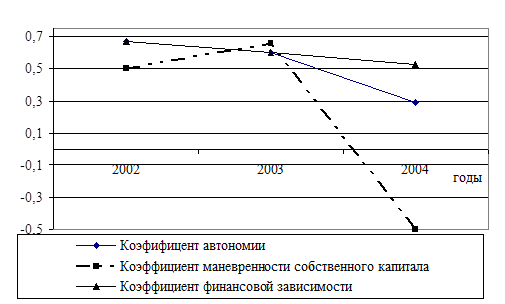 Коэффициент маневренности собственного капитала в 2002-2003 гг. в пределах нормы и увеличивается к концу периода анализа. В 2004 году значение данного показателя отрицательное, что свидетельствует об отсутствии собственных оборотных средств у предприятия.