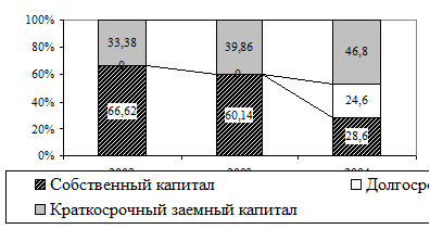 Доля долгов всех видов в общих финансовых источниках несколько с 33,38% в 2002 году до 71,4% в 2004 году, их размер превысил 1/2 собственного капитала, что свидетельствует о снижении финансовой независимости.