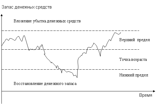 Логика действий финансового менеджера по управлению остатком средств на расчетном счете заключается в следующем. Остаток средств на счете хаотически меняется до тех пор, пока не достигает верхнего предела. Как только это происходит, предприятие начинает покупать достаточное количество ценных бумаг с целью вернуть запас денежных средств к некоторому нормальному уровню (точке возврата). Если запас денежных средств достигает нижнего предела, то в этом случае предприятие продает свои ценные бумаги и таким образом пополняет запас денежных средств до нормального предела (рис. 6).