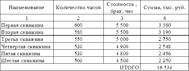 Для того чтобы расконсервировать скважины необходимо нанять бригаду, стоимость работы бригады один час составляет от 4500 - 5500 руб. Время на расконсервацию одной скважины уходит от 500 - 600 часов. Упрощенно время работы и стоимость работы бригады зависит от сложности работы и от глубины скважины. Расчет данных показателей приведен в таблицах 3.1 и 3.2.