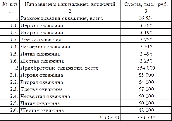 Общая сумма капитальных вложений на приобретение новых скважин включает в себя следующие затраты: