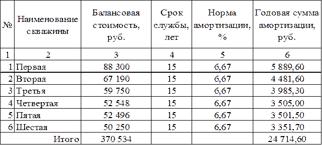 На основе данных о стоимости скважин рассчитывается годовая сумма амортизационных отчислений, которая равна отношению суммы произведения нормы амортизации по i – группе основных производственных фондов и балансовой стоимости i – группы основных производственных фондов к 100%.