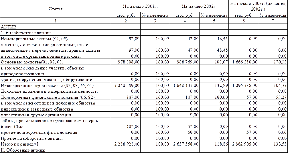 повлияло. На начало 2001г. прочие внеоборотные активы составляли наибольший удельный вес 39,49% по сравнению с основными средствами 31,14%. Но к началу 2003г. ситуация изменилась и основные средства увеличились на 11,07 п.п., а прочие внеоборотные уменьшились на 6,64 п.п. Из таблицы 2.5 видно, что прочие внеоборотные средства в основном состоят из незавершенного строительства. Запасы и затраты на начало 2003г. уменьшились на 1,05 п.п., несмотря на что НДС по приобретенным ценностям увеличился на 2,47 п.п., но из-за уменьшения сырья, материалов и аналогичных ценностей на 0,8 п.п. Дебиторская задолженность покупателей и заказчиков снизилась на 10,95 п.п., также снизились авансы выданные на 0,78п.п., а прочие дебиторы увеличились на 7,78 п.п. Следовательно, общая дебиторская задолженность снизилась незначительно на 3,96 п.п.