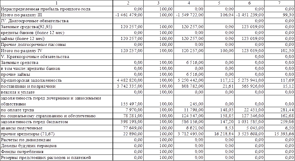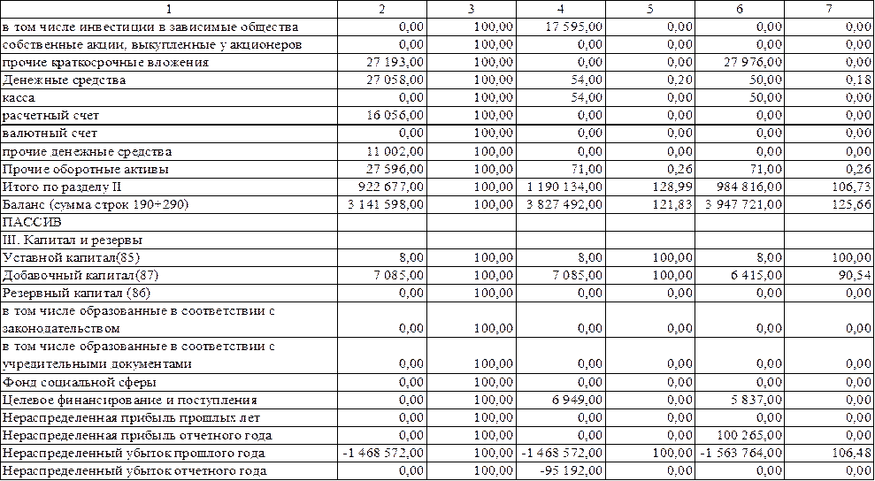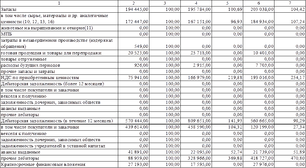 Данные горизонтального анализа по укрупненной номенклатуре статей сводятся в таблице 2.6 (баланс-нетто). В таблице 2.7 приводятся данные горизонтального анализа по исходному балансу (балансу-брутто). Данные по всем статьям базисного года n принимаются за 100%. На основе данных таблиц 3.6 и 3.7 делаются выводы о темпах изменения основных статей баланса и о главных причинах, обусловивших эти изменения.
