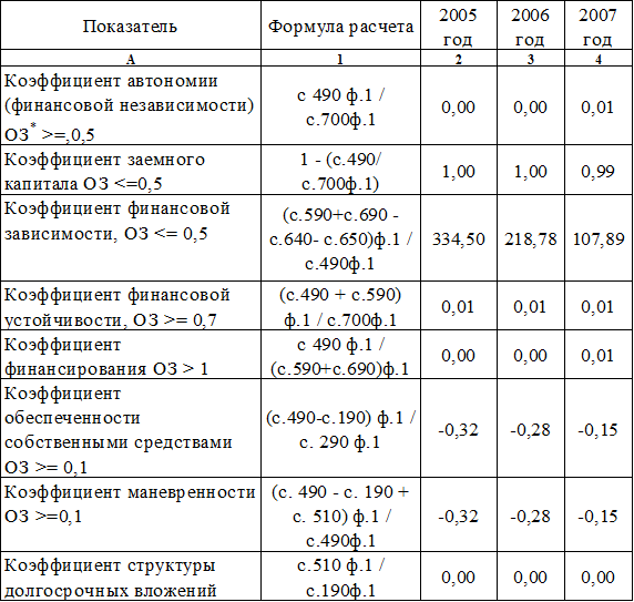 Данные таблицы 4.1 показывают, что коэффициент автономии в 2005 году составил 0,001, к 2007 году – 0,01. Таким образом, большая часть активов предприятия сформирована за счет заемного капитала. Значение коэффициента ниже уровня оптимального значения, следовательно, предприятие не обладает достаточной независимостью и возможностями для проведения независимой финансовой политики.