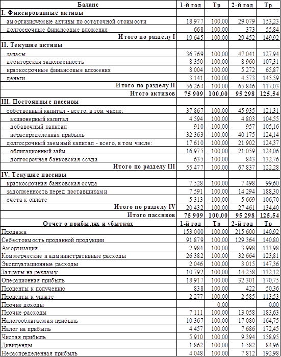 В пассиве баланса в большей степени выросли текущие пассивы, где темп роста составил 134,4 %. На это повлиял значительный темп роста задолженности перед поставщиками, который составил 188,3 %, при этом не значительное снижение краткосрочной банковской ссуды за текущий период на 0,4 % не оказал никакого влияния. Данное снижение темпа роста в пассиве баланса является единственным, остальные статьи пассива имеют положительный темп прироста. Постоянные пассивы выросли на 32,76 %, на что оказало практически равное влияние увеличение собственного капитала на 21,31 % и долгосрочного заемного капитала на 24,37 %, что характеризуется ростом фиксированных активов. Собственный капитал имеет данный темп роста в основном из-за роста нераспределенной прибыли, которая выросла на 24,14 %, данное увеличение говорит об эффективной деятельности предприятия. Акционерный капитал и добавочный капитал увеличился не значительно, всего 4,55 % и 5,16 % соответственно, это говорит о том, что предприятие не придерживается политики увеличения стабильности собственной базы. Темп роста кредиторской задолженности значительно превышает темп роста дебиторской задолженности, что может являться следствием финансовых затруднений предприятия. Данное превышение связано с тем, что предприятие увеличивает свои фиксированные активы и расширяет операционную деятельность притом, что темп роста собственных источников финансирования ниже темпа роста привлеченных средств на 8,45 %. Поэтому предприятию следует предпринять меры по снижению роста привлеченных средств и увеличению собственных. На основании отчета о прибылях и убытках можно сделать вывод, что темп роста продаж вырос на 40,92 %. При этом также значительно увеличилась и расходная часть, где наибольший темп роста приходится на прочие расходы – 183,63 %. Предприятию необходимо рассмотреть причины данного увеличения, по скольку эти расходы не связаны с операционной деятельностью предприятия, которая имеет стабильный рост. Снижение темпа роста выявлено лишь по процентам к получению, а также дивиденды, что составили 50,36 % и 84,96 % соответственно. Снижение процентов к получению и отсутствие как в 1-м году, так и во 2-м прочих доходов говорит о том, что предприятие ориентирует свою деятельность лишь на основной. Снижение дивидендов свидетельствует о том, что предприятие накапливает прибыль, не выплачивая дивиденды. На основании анализа отчета о прибылях и убытках можно сказать, что нераспределенная прибыль выросла практически в 2 раза, при этом темп роста ее составил 192,98 %, что положительно характеризует деятельность предприятия.