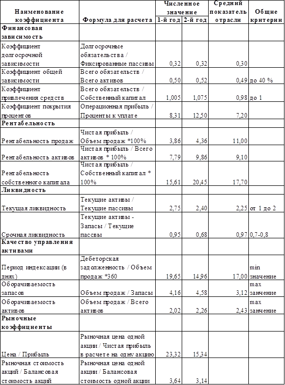 Коэффициент общей зависимости составляет 0,5 в 1-м году и 0,52 во 2-м году, то есть говорит о том, что активы предприятие финансируются больше за счет заемных средств, чем за счет собственных. При этом как в первом году так и во втором году данный показатель превышает среднеотраслевой показатель, который составляет 0,49, что характеризует повышенную зависимость от внешних источников финансирования. Если рассматривать данный показатель с точки зрения кредитоспособности заемщика, то коэффициент общей зависимости должен варьироваться в пределах до 0,4, таким образом, превышение этого критерия как в 1-й год, так и во 2-й год говорит о том, что данный коэффициент определяет предприятие к классу неустойчивых заемщиков. То есть, это говорит что в связи с высокой зависимостью от привлеченных средств, у предприятия может возникнуть риск неплатежеспособности в период спада деловой активности и риск отказа в получении кредита Данное превышение заемных средств и рост показателя свидетельствует о снижении стабильности финансовой структуры средств.
