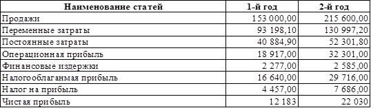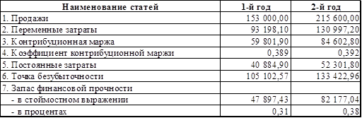 На основании данных вычислений можно сказать, что контрибуционная маржа за первый год составила 59 801,9 тыс. долл., что превышает постоянные расходы за данный период на 18 917 тыс. долл., тем самым свидетельствует о достаточности их покрытия и способности предприятия получать прибыль. Во втором году контрибуционная маржа составила 84 602,8 тыс. долл., то есть также превышает постоянные затраты на 32 301 тыс. долл., соответственно покрывает постоянные затраты за данный период и предоставляет предприятию прибыль.