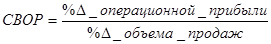 Действие операционного рычага проявляется в том, что любое изменение выручки от реализации всегда порождает более сильное изменение прибыли. Проанализируем изменение операционной прибыли за счет изменения продаж. Для этого необходимо рассчитать силу воздействия операционного рычага: