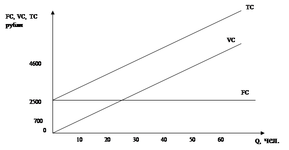 На графике FC – постоянные издержки (коммунальные платежи и оплата труда), VC – переменные издержки, зависящие от количества пациентов, TC – общие издержки (сумма постоянных и переменных издержек).