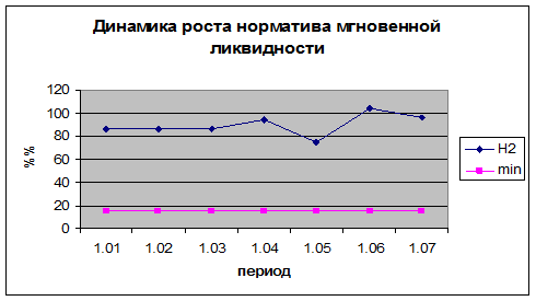 Так по состоянию на 1 января Н2 принимал значение 86,16%; на 1 февраля-85,82%; на 1 марта-86,20%, на 1 апреля-94,00%, на 1 мая - 74,71%, на 1 июня-104,22%; на 1 июля – 96,14%. Наиболее сильное снижение норматива мы наблюдаем на 1 мая, это связано со снижением высоколиквидных активов, по сравнению с базисным периодом они снизились на 31060 тыс. руб., в то время как обязательства до востребования снизились лишь на 29703 тыс. руб.(Приложение Е) Полученные значения норматива мгновенной ликвидности на отчетные даты удовлетворяют значениям, установленным Инструкцией 110-И, ограничивает риск потери ликвидности в течение одного операционного дня, то есть у банка имеется возможность погасить обязательства до востребования с помощью высоколиквидных активов.