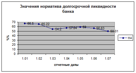 Норматив долгосрочной ликвидности по состоянию на 1 января составил 66,50%, а на 1 июля -50,01% при максимальном значении норматива 120%. На рисунке 10 мы видим тенденцию изменения значений норматива долгосрочной ликвидности.