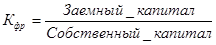 Кфр – это отношение заемного капитала к собственному капиталу; это самый весомый показатель, который свидетельствует о финансовой независимости предприятия от привлечения заемных средств. Он показывает, сколько заемных средств привлекает предприятие на 1 грн. собственного капитала.