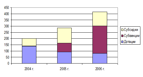 Следует отметить, что снижение доли собственных доходов происходит не только за счет изменения бюджетного и налогового законодательства, но и за счет того, что муниципалитетам не выгодно обеспечивать рост собственных доходов, так как это обернется для них снижением объема финансовой помощи. Снижение уровня налоговых и неналоговых доходов говорит о повышении зависимости в 2005 году местного бюджета от вышестоящего бюджета. На рис. 2.10. отчетливо видно изменение финансовой помощи в разрезе видов финансирования. Значительный рост в 2006 году субвенции, это в 3,2 раза больше чем в 2005 году. Столь высокий показатель обусловлен передачей на уровень муниципальных районов государственных полномочий и полномочий поселений. Федеральный закон № 131-ФЗ «Об общих принципах организации местного самоуправления в Российской Федерации» радикально сменил систему межбюджетных отношений, установил новые подходы к организации местного самоуправления на территории Российской Федерации и новые принципы функционирования финансовой системы муниципального образования. Наиболее значимым нововведением стало наделение муниципального образования полномочиями по решению вопросов местного значения. Финансирование подразделений, зарегистрированных на территории муниципального образования, осуществляется через местный бюджет за счет выделяемых средств областного бюджета в виде субвенций (бюджетные средства, предоставляемые бюджету другого уровня бюджетной системы Российской федерации на безвозмездной и безвозвратной основах на осуществление определенных целевых расходов):